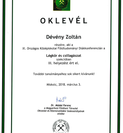 Intézményünket a 2018. március 2-án és 3- án megrendezett XI. Országos Középiskolai Földtudományi Diákkonferencián Dévény Zoltán és Rappay Bence 12. C osztályos tanulóink képviselte. Felkészítő tanáruk Barocsai Zoltán tanár úr volt.oklevel