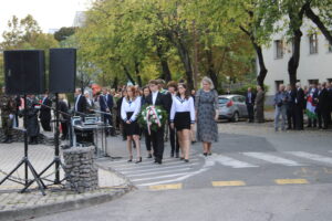 Gimnáziumunk vezetői és diákjainak képviselői elhelyezik a koszorúnkat.