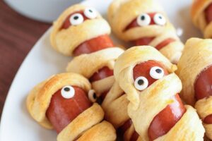 - A virsliket betekerjük 2 irányból a tésztacsíkokkal úgy, hogy egy részén helyet hagyunk a szemeknek.